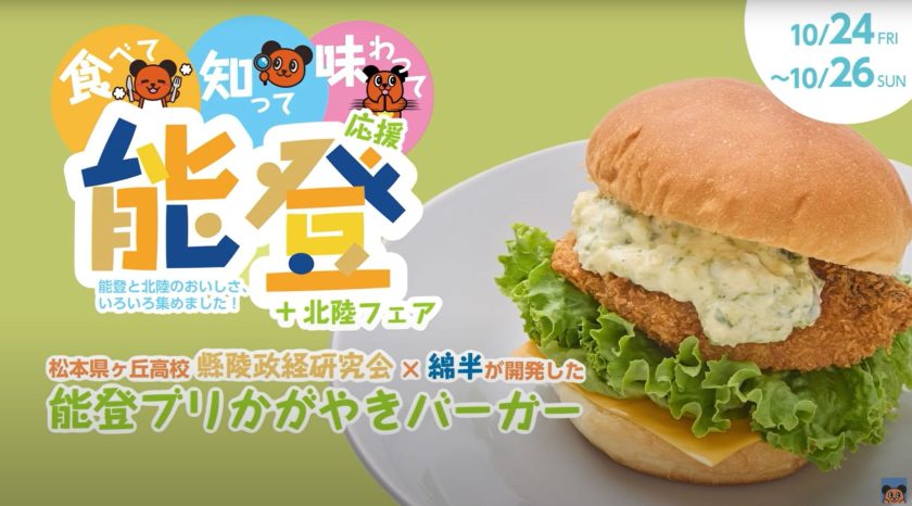 「海の政策コンテスト」で最優秀賞を受賞した、2年A組瀧澤さん・宮下さん・八子さんのチーム「縣陵政経研究会」は、綿半パートナーズ様と開発した 「能登ブリかがやきバーガー」を、綿半各店で販売します。