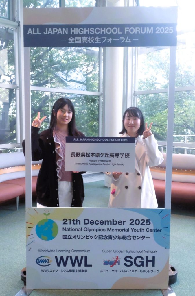 「WWL(ワールド・ワイド・ラーニング)コンソーシアム構築支援事業」および「SGH(スーパーグローバルハイスクール)ネットワーク」に参加する全国の高校生が一堂に会し、日頃の探究活動の成果を英語で発表・議論する「全国高校生フォーラム」(主催:文部科学省、株式会社Aoba-BBT)が12月21日(日)、国立オリンピック記念青少年総合センターで開催され、本校より2Bの矢口さんと曽我部さんが参加しました。
