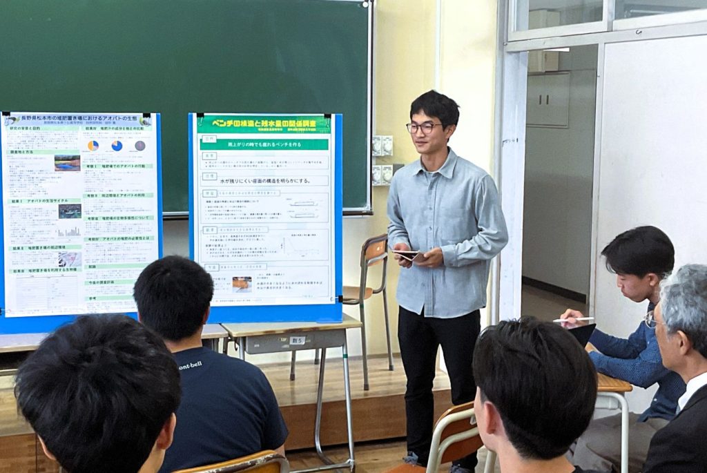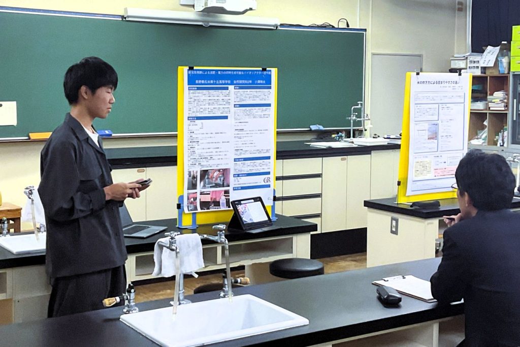 諏訪清陵高校の課題研究中間発表会・課題研究研修会「清陵サイエンスサミット」が10月4日(土)に行われ、2年探究科で自然科学系の個人探究を行っている11名が参加させていただきました。発表会は、1人10分の持ち時間でポスターによる発表、質疑応答。県内外の高校生が80名ほど参加しました。助言者は信州大学、諏訪東京理科大学などの大学の先生方でした。