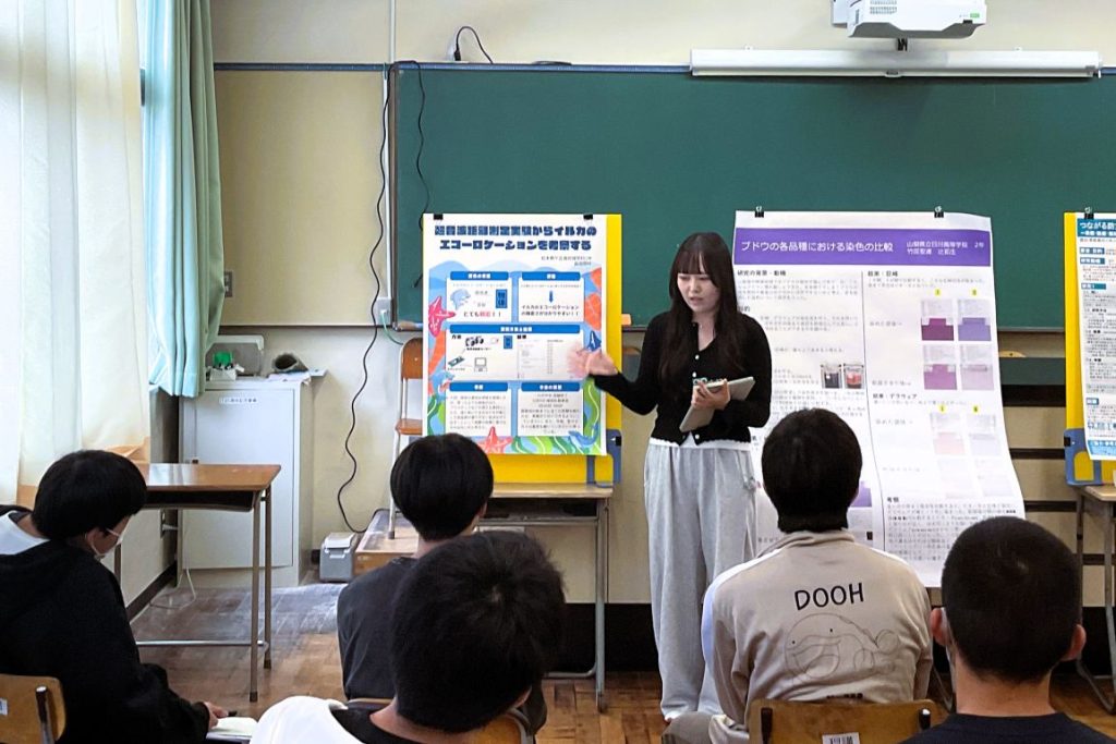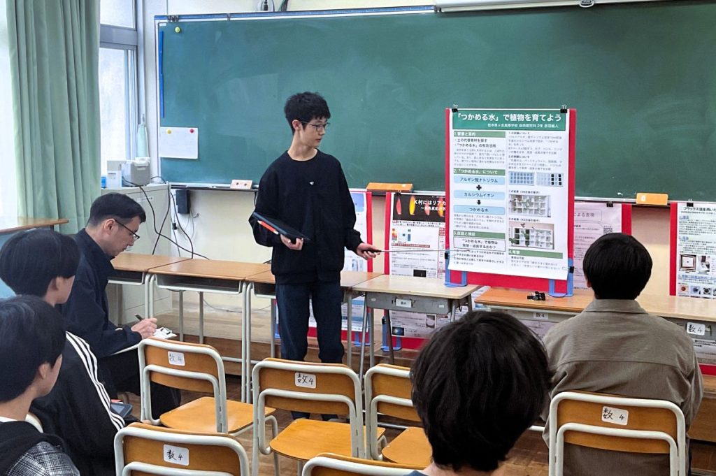 個人での探究発表は本校だけでしたが、緊張しながらも自分の探究について一生懸命説明し、鋭い指摘にも精一杯答える姿が見られました。全体講評では、探究を楽しむ余裕をもつこと、外に出て他人を巻き込むこと、もらったアドバイスをうのみにせず検証すること、継続することが大切であるなどのアドバイスをもらいました。探究も徐々にまとめに入っていきますが、生徒たちは今後の探究活動に活きるヒントをたくさん得ることができたようです。